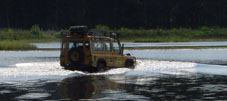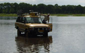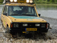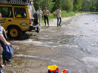 Ondertussen is Mark op de terug weg en op de vraag: Wat ga jij doen?, antwoord hij lakoniek: Mijn auto halen! En jawel, een eindje verderop komt Mark met de Discovery uit de bossen en rijdt door het water in onze richting. Ziet er allemaal schitterend uit, maar als Mark met een stevige snelheid bij ons het water weer uitrijdt wordt hij achtervolgd door een ware vloedgolf van water. Net te laat probeert iedereen stoeltjes, lunchpakketjes, handdoeken, speelgoed en kinderen van het strandje op te rapen, maar het kwaad is al geschied, bijna alles is nat en iemand is een schoentje kwijt. Hilariteit alom. Als fotograaf probeer ik nog net dit op foto vast te leggen en tegelijk mijn voeten droog te houden, was voor beide initiatieven net iets te laat. Maar ik heb tenminste mijn schoenen nog. |