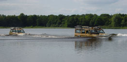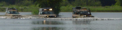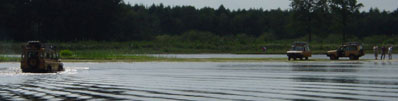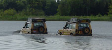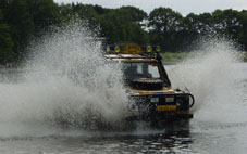 Michel is de eerste die al snel bijna honderd meter ver het water in gaat en zonder problemen weer terugkomt. Matthijs zit verveeld en somber te kijken omdat ie zelf niet mag rijden. Als even later ook Wim het water in rijdt merkt deze dat een benzine motor toch even anders is als een diesel. | ![]() |