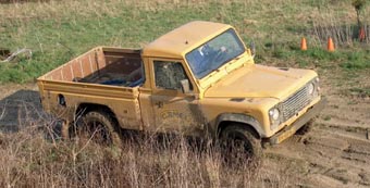 | Na enkele aanwijzigingen van Gerard en wat uitleg over het terrein was Jaap toch de eerste die zich in de modderige sporen stortte. Helaas na amper 7 seconden resulteerde dit in een vrij stabiele positie diep in de modder. Overigens is dat niet op deze foto. Hier rijdt Jaap alweer vrolijk verder. Gerard wist ons later te vertellen dat Jaap met zijn Hi-Cap te weinig druk op zijn achteras heeft. Deels wisten we dit te compenseren door een aantal banden achter in de bak te plaatsen. Het was naar later bleek niet de laatste keer dat Jaap vast kwam te zitten. Hij was niet de enige die dit overkwam! |
