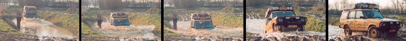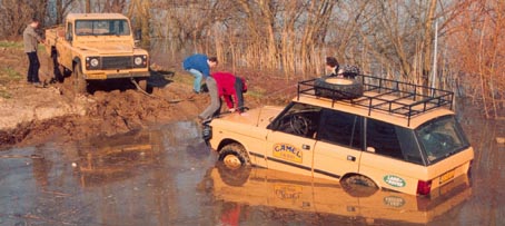 In navolging van Jaap besluiten Wim en Marijn ook hun geluk te beproeven. De eerste de eerste de beste waterplas werd uitgekozen om het drijfvermogen van de Range Rover uit te testen. Dit bleek een test TNO onwaardig. Terwijl de auto aan de achterkant al aardig water begint te maken klimt Wim uit het raam, over de motorkap naar de bullbar om daar van Jaap (die inmiddels alweer los was) en Bert hulp te ontvangen. Na enkele pogingen weet Jaap het tweetal te redden en eens op het droge slaat de auto alweer snel aan en spuit een forse portie water uit de uitlaat. Niks aan de hand, gewoon doorrijden. |