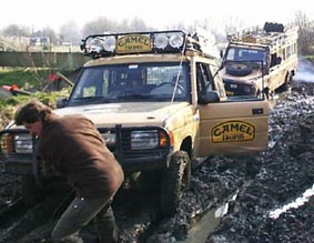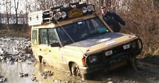 | Voor degenen die niet meerijden maar alles vanaf een afstandje hoofdschuddend staan te bekijken, valt er dan ook genoeg te lachen. De één na de ander stort zich in het terrein om vervolgens ergens in de blubber vast te komen staan. Als Wim even later voor de tweede keer vast komt te zitten, is het Bert die hem te hulp schiet. Hoopvol word er gewerkt om De Range Rover los te krijgen, maar voordat het zover is zit ook Bert hopeloos vast. Gerard Blankestijn, die dit alles met lede ogen aanziet schiet te hulp. Als ex Camel Trophy rijder weet hij zonder problemen de vastrijders te bereiken en als Wim los is, is het de beurt aan Bert. Maar deze zit dusdanig vast dat de lier eraan te pas moet komen. Het vergde wel wat werk maar ook Bert kon uiteindelijk weer rijden. Op dus naar de volgende plek om vast te gaan zitten. Dan besluit Gerard, die terecht van mening is dat wij meer vastzitten dan rijden, om alle rijders maar eens bij elkaar te roepen om ze wat advies en tips te geven. Een goed idee. Echter, nog voordat Gerard is uitgesproken zitten er verspreid over het terrein alweer drie vast. |