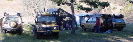 | Het is nog vroeg in het jaar en dus zijn de nachten nog behoorlijk koud. Als ‘s morgens bij het ontwaken iedereen nog rillerig is, komt hierin al snel verandering als de zon opkomt. Langzaam maar zeker verschuift de zon richting plateau en de temperatuur zal gedurende de dag nog verder stijgen. Een boterham, een kop koffie en na wat overleg en een laatste hand aan verschillende auto’s besluit de groep om de auto’s te starten en een begin te maken met deze ‘Camel Trophy’. | |||
