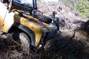 Althans, als we alle auto’s hier dan ook doorheen krijgen. Na een hele poos zweten is het dan zover. Mark gaat als eerste proberen de oversteek te maken en zijn auto op het pad zetten. Naar beneden en door het water is geen probleem, naar boven wel en al snel zit hij vast. De lier komt eraan te pas en meter voor meter komt hij los. | |