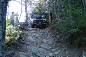 | Na wat overleg wordt besloten om in twee teams aan het werk te gaan. Beide teams moeten enkele forse hoogteverschillen zien te verkleinen. Terwijl Gerard, Maikel en Wim vlak waar Gerard met zijn auto stopte een enorm gat beginnen op te vullen met rotsblokken, beginnen Mark, Axel en Jaap met boomstammen te sjouwen om verderop een afdaling mogelijk te maken. Pia probeert het een en ander op film vast te leggen kijkt met een kritisch oog naar de vorderingen van de werkers. | |||