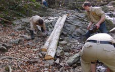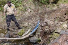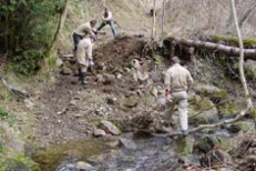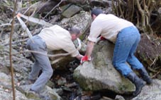 | Ook de komende dag zal vol verrassingen zitten. Een ander pad wordt opgezocht en al snel bereiken we via een smal pad en gegeseld door boomtakken een beekje wat aanvankelijk niet berijdbaar lijkt. Opnieuw een stukje verkennen en weer aan het werk. Het duurt niet lang of al snel staan er 3 of 4 mensen in het water gaten te vullen en rotsblokken te verplaatsen. | |||