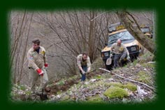 | Aanvankelijk wordt er gereden over goed begaanbare bospaden maar gaandeweg wordt het terrein steeds pittiger. Axel en Gerard rijden regelmatig iets verder voor de groep uit als dezen plots via 27 MC laten weten dat we moeten omkeren. Het terrein wordt blijkbaar te heftig om goed door te kunnen komen. Als iedereen uitstapt om een kijkje te gaan nemen wordt er gezamenlijk overleg gepleegd en alsnog wordt er een route gevonden. Dit tot grote schrik van Wim die toch even moet slikken als hij ziet wat de plannen zijn. Als Jaap als eerste zijn auto op twee wielen zet en zijn bumper tegen een omgevallen boomstronk parkeert geeft Wim te kennen dat ie niet van plan is om deze afdaling te maken. | |||