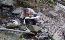 | Gerard zal als eerste gaan gevolgd door Jaap. Als beiden na enige tijd weer uit het water zijn wordt er eerst verder verkend. Slechts een klein stukje verder komen we al uit het bos en staren verbaasd naar een prachtig stuk natuur voor ons. Dit is geen beekje meer. Het water is een stuk dieper met behoorlijke hoogteverschillen. Hier zal erg veel werk moeten worden verzet om aan de overkant, zo’n 150 meter verder, te kunnen komen. | ![]() |