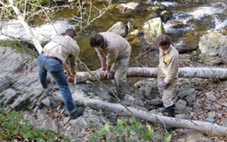 | Na diverse omzwervingen in dit terrein weten we uiteindelijk een brug te vinden die door de Camel Trophy selectie gebouwd is, jaren geleden! Het vergt geen kennersoog om vast te stellen dat deze niet langer bruikbaar is. Voorbij de brug is iets wat aangeeft dat het pad daar zo’n 10 jaar geleden verder moet zijn gegaan. Hier ligt dus een echte uitdaging. De brug herstellen is uitgesloten. Als we langs de brug wat afdalen kunnen we het water oversteken en vinden daar een doorgang van iets meer dan 1 meter breed. Na wat wikken en wegen wordt besloten om deze te verbreden en te trachten over te steken. Allereerst wordt het ‘pad’ weer verkend. Bij terugkomst melden de verkenners dat het pad smal is en op diverse plekken behoorlijk hellend met links rotsen en bomen en rechts veel ruimte om naar beneden te sodemieteren. We hebben een motorzaag, pikhouwelen, scheppen, handschoenen, rijplaten, 4 auto’s met elk een lier en een hoop goeie spirit. Aan de slag dus! |
