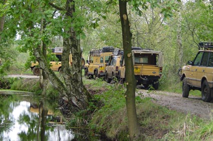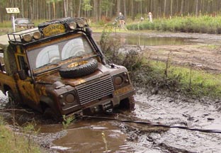| Na deze rustpauze wordt de rit weer vervolgd. Hoewel de rit tot nu toe zonder al teveel problemen werd gereden en alle auto’s het prima deden zal hier spoedig verandering in gaan komen. Na nog een poosje over landbouwwegen en hobbelige bospaden te hebben gereden komen we aan op een punt waar de route een beetje tot stilstand komt. Een aantal forse waterplassen en flink wat modder vormt een ideale plek voor ons speelkwartier. | ||