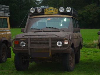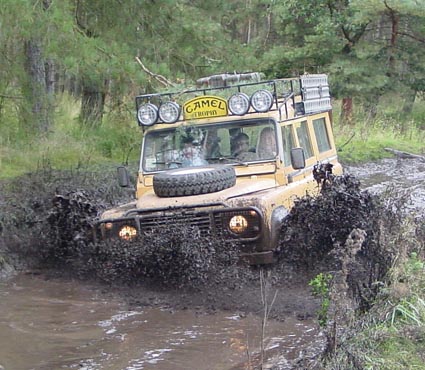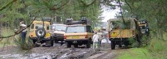 | De Camelkleurige auto’s veranderen hier al snel in onherkenbare moddermonsters. Van rusten is niet veel sprake. De een na de ander weet zich uiteindelijk wel ergens vast te rijden. Sleepkabels en hulptroepen moeten regelmatig in actie komen om de auto’s uit een steeds dieper spoor los te trekken. Enkele wandelaars hebben zelfs stoeltjes meegenomen en zijn er eens rustig voor gaan zitten om te kunnen genieten van zoveel spektakel. Uiteraard wel ver genoeg verwijderd van de opspattende modder. | ![]() |